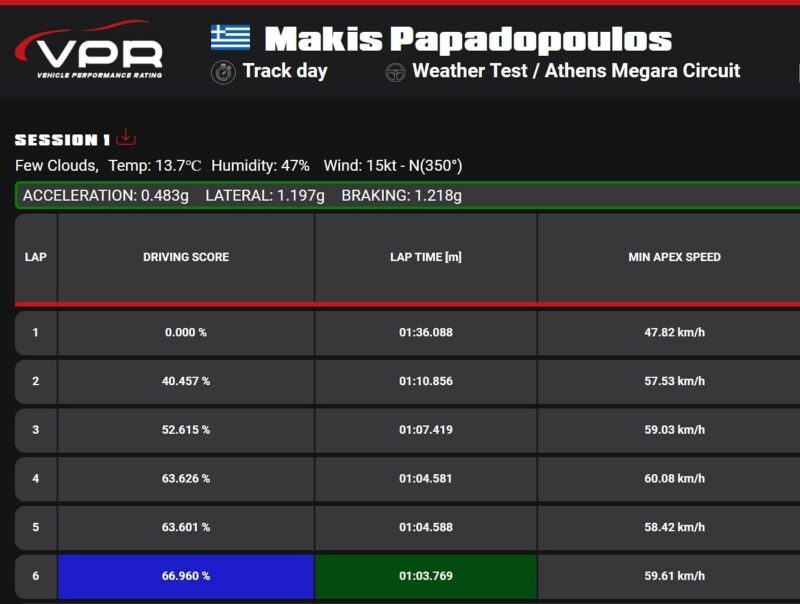 Evaluate your Acceleration, Lateral and Braking performance while also considering all the important parameters. VPRating now provides you with live weather conditions for each session. Check live the Temperature, Humidity, Wind Speed and Direction for each of your driving sessions.